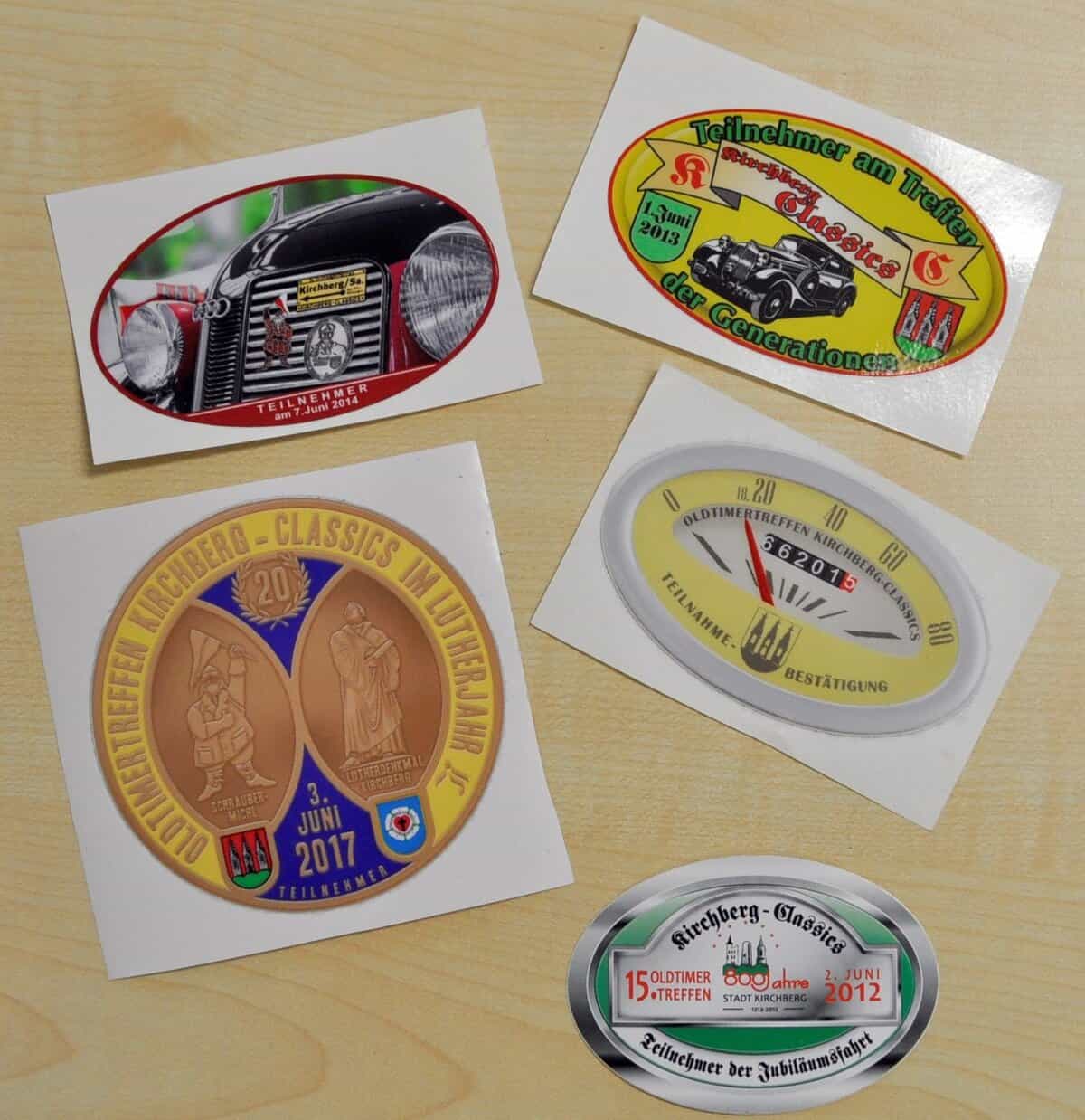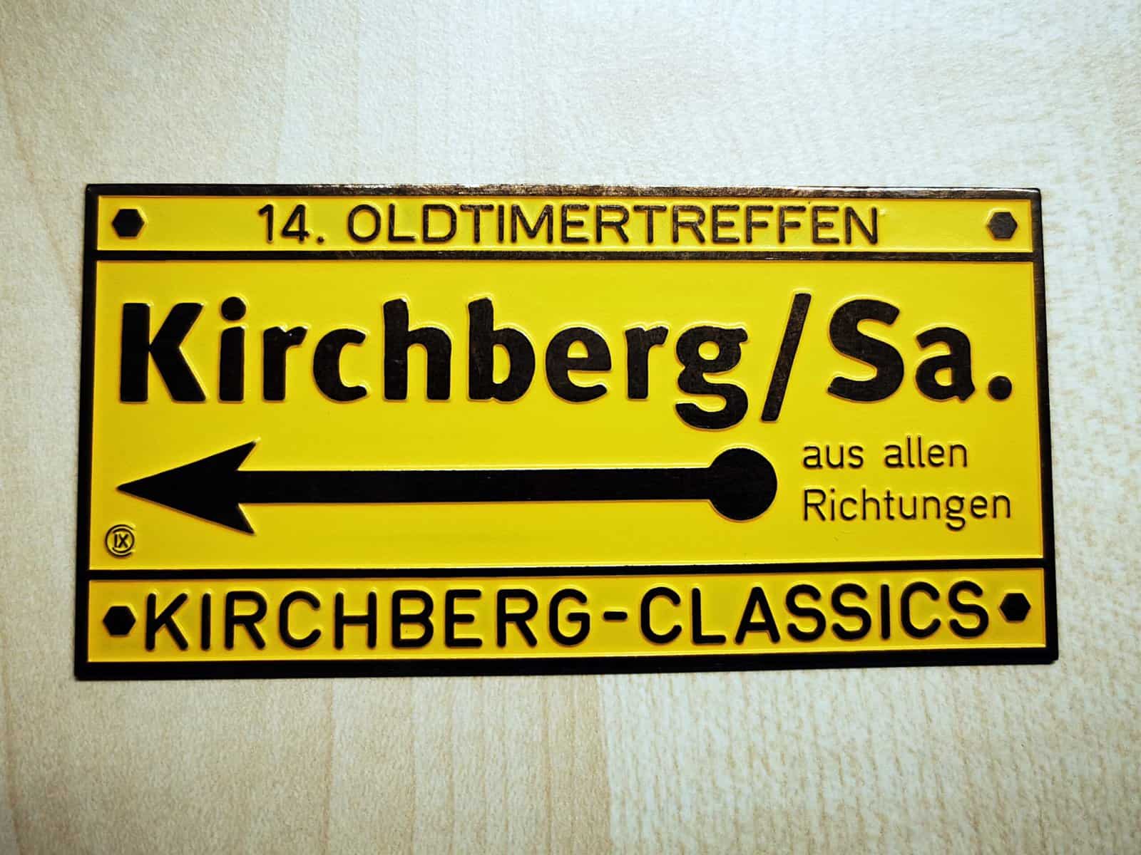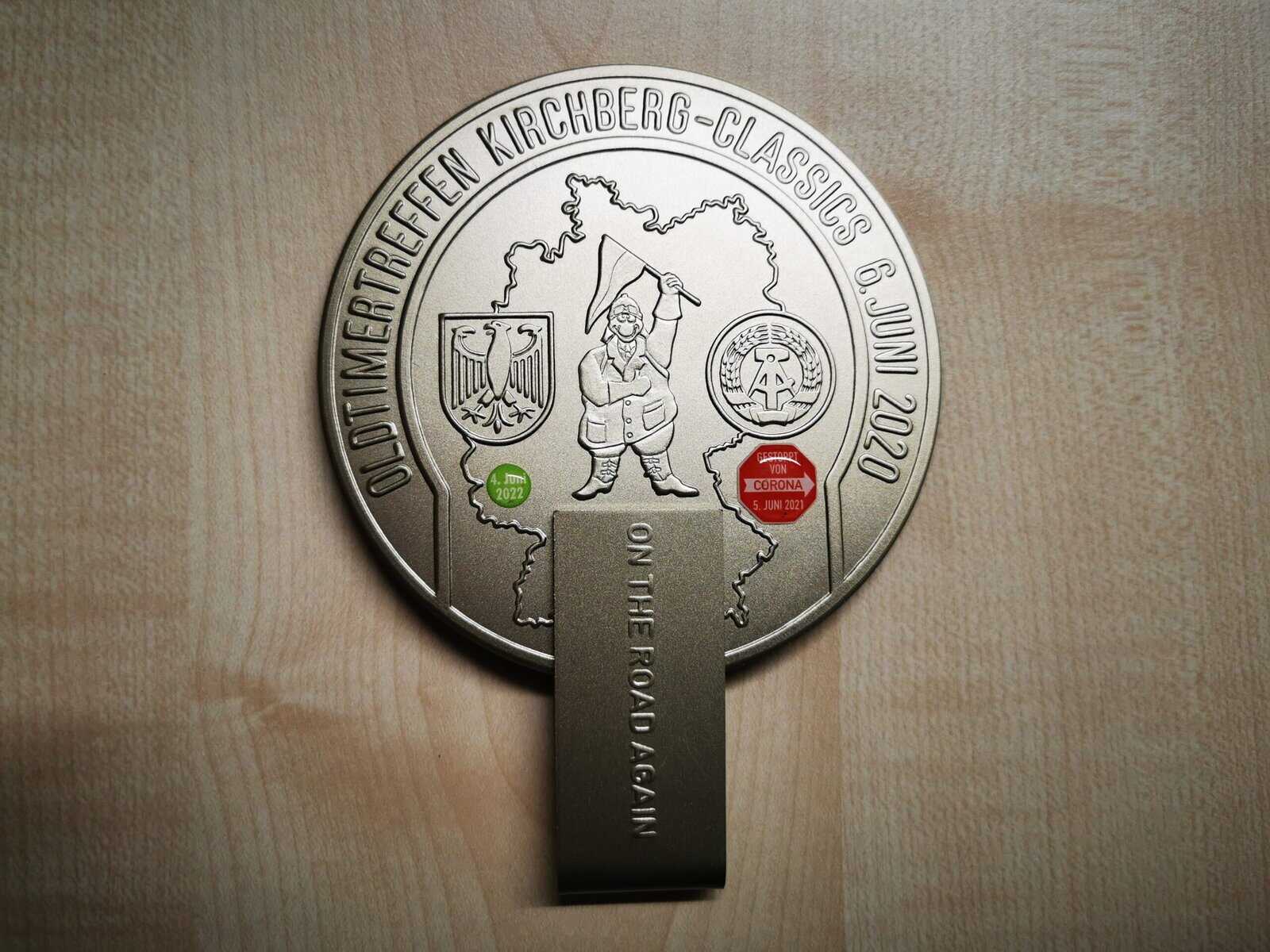 Zweiteilig: Auf der runden Plakette sind die Umrisse Deutschlands, der Schraubermichl, zwei Wappen sowie die Aufschrift „Oldtimertreffen Kirchberg-Classics 6. Juni 2020“ eingeprägt. Da das Treffen aufgrund von Corona zweimal ausfallen musste und erst 2022 wieder stattfinden konnte, sind zudem zwei zusätzliche kleine Aufkleber auf die Plakette aufgebracht worden: zum einen das Datum „4. Juni 2022“ auf grünem Grund, zum anderen der Schriftzug „Gestoppt von Corona 5. Juni 2021“ auf rotem Grund.