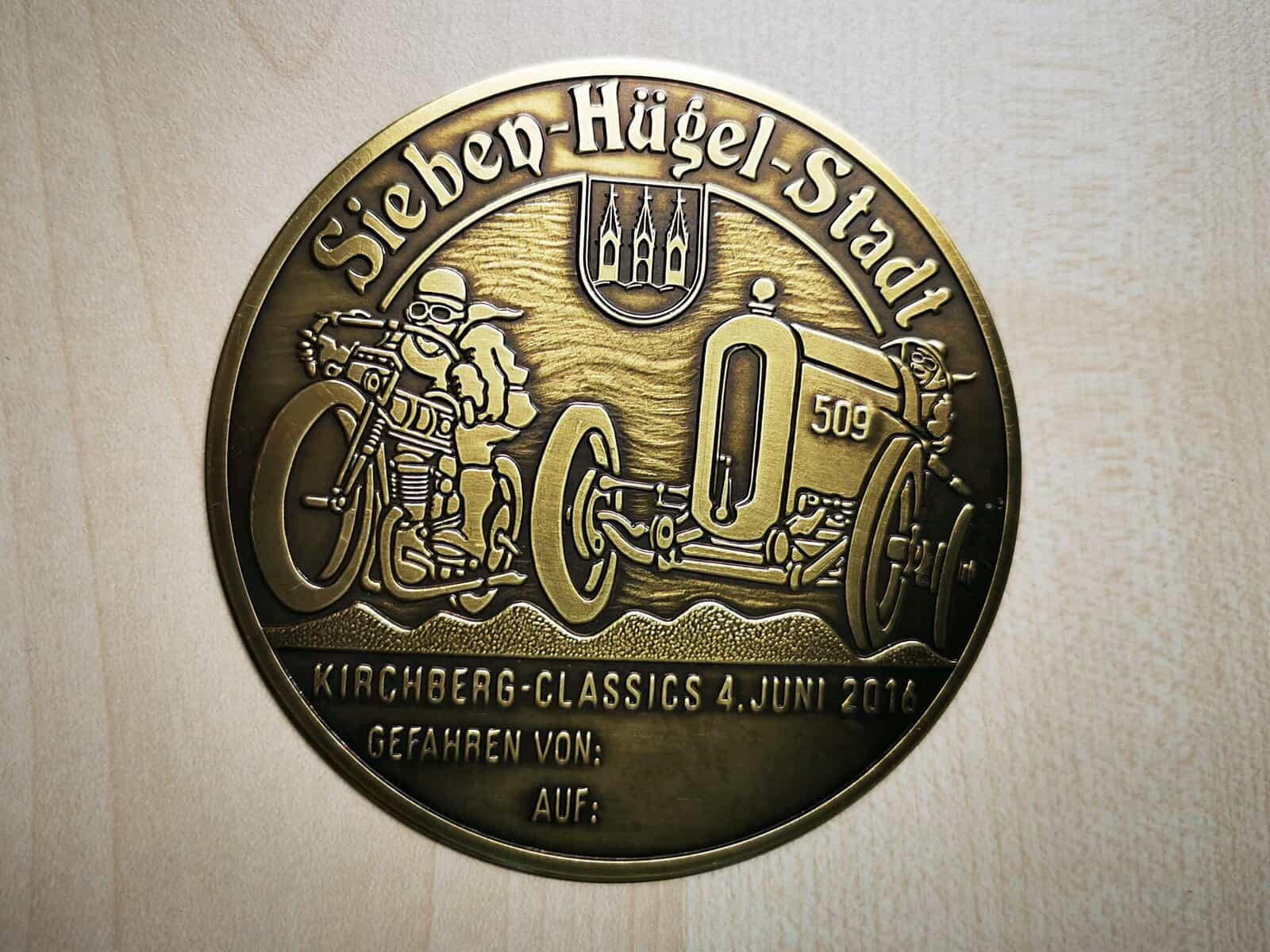 Eingeprägt sind zwei Oldtimer, das Wappen der Stadt Kirchberg sowie die Schriftzüge „Sieben-Hügel-Stadt“, Kirchberg-Classics 4. Juni 2016, „Gefahren von:“ sowie „Auf:“.