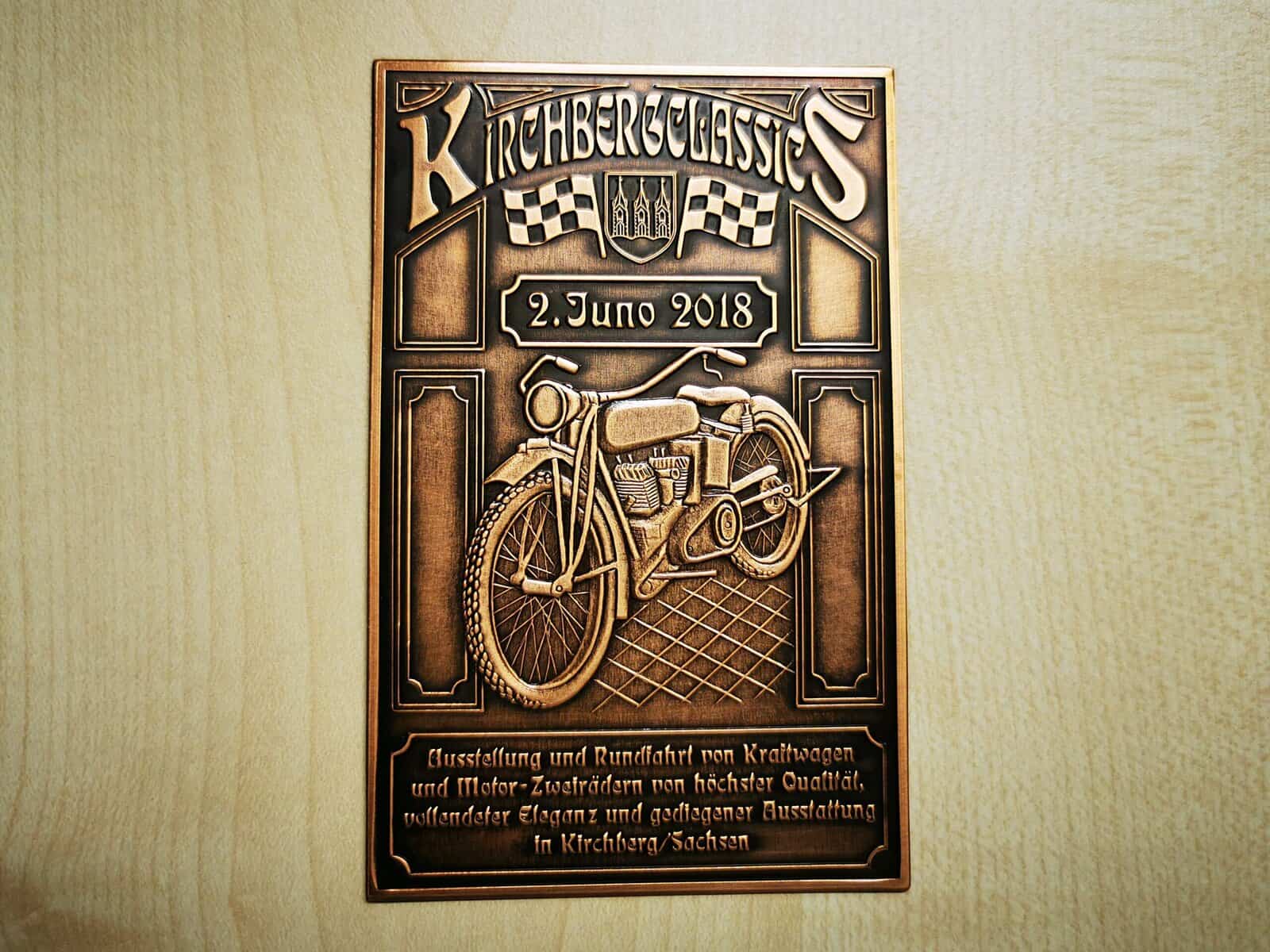 Eingeprägt ist ein Oldtimer-Motorrad sowie die Schriftzüge „Kirchberg Classics“, „2. Juno 2018“, „Ausstellund und Rundfahrt von Kraftwagen und Motor-Zweirädern von höchster Qualität, vollendeter Eleganz und gediegener Ausstattung in Kirchberg/Sachsen“.