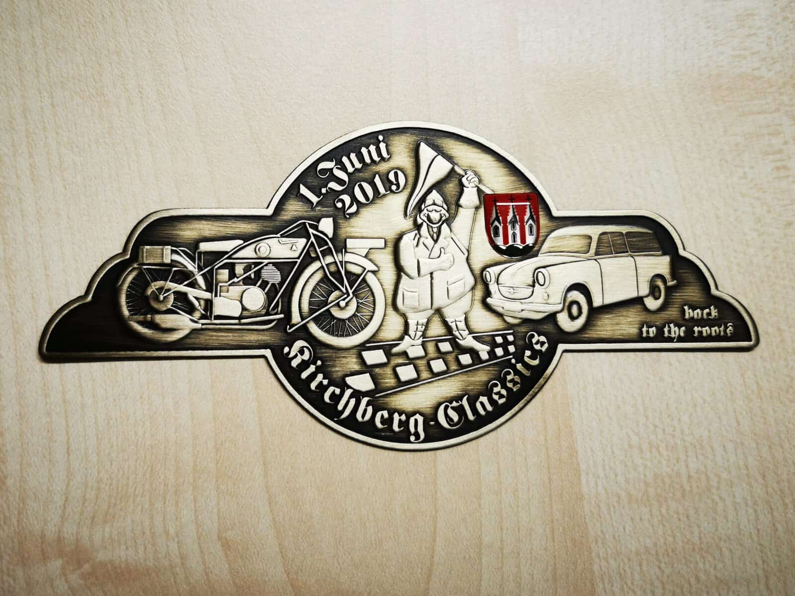 Eingeprägt sind der Schraubermichl, zwei Oldtimer sowie das Wappen der Stadt Kirchberg und die Schriftzüge „1. Juni 2019“, „Kirchberg-Classics“ und „back to the roots“.