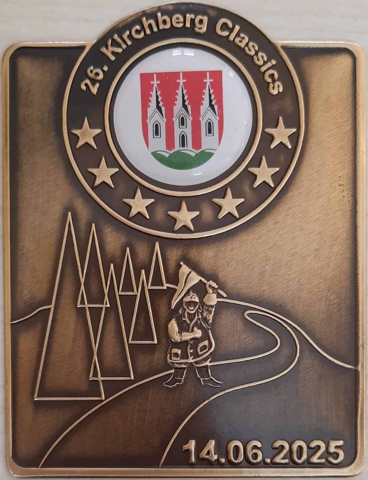 bronzefarben mit der Aufschrift „26. Kirchberg Classics“, „14.06.2025“, dem Wappen der Stadt Kirchberg, dem Maskottchen „Schrauber Mich’l“ sowie stilisierten Bäumen und einer Straße.