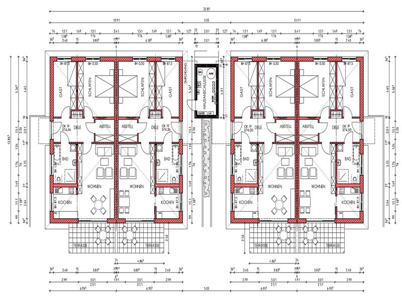 Auf einer Gesamtgrundstücksfläche von ca. 1583 m² entstehen zwei Doppelhäuser mit insgesamt 4 barrierefreien Eigentumswohnungen. Die Grundstücke werden entsprechend geteilt und haben eine Größe von ca. 335 m² bis ca. 496 m².